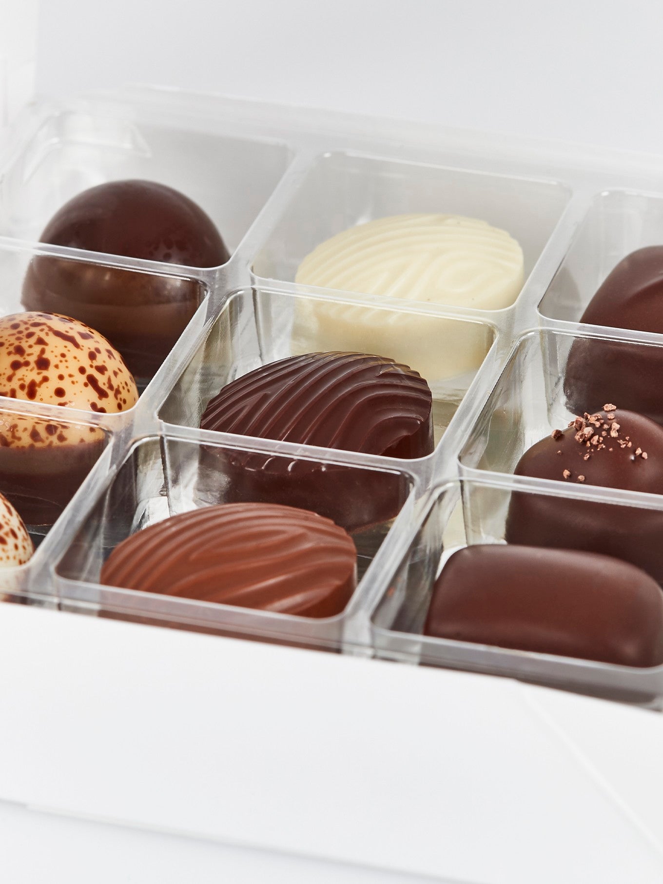 Collection 9 indeholder 9 forskellige varianter af vores raffinerede, klassiske fyldte chokolader. Æsken byder delikate oplevelser i form af blandt andet marcipan af stenvalsede middelhavsmandler, praliné, mynte og karamel.